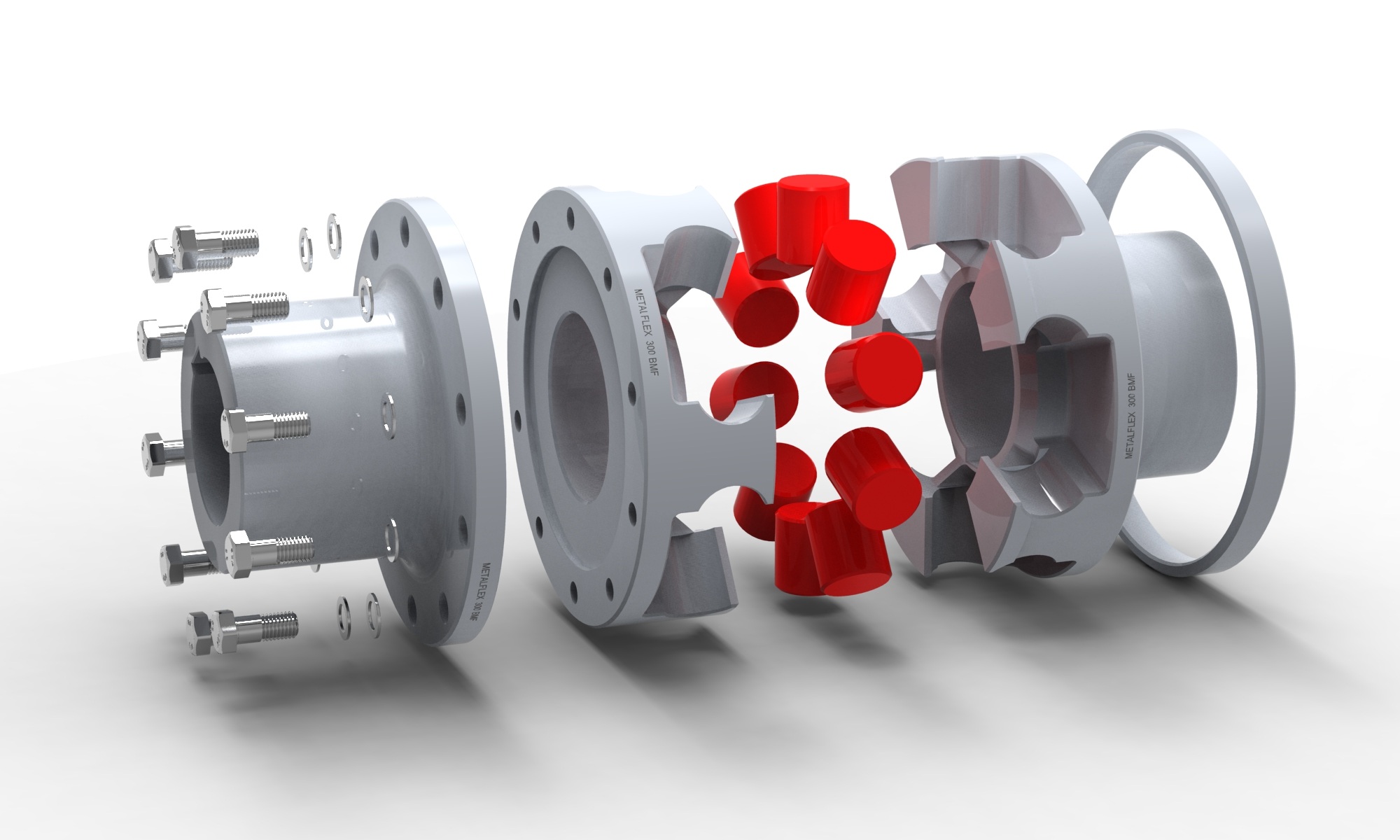 Acoplamento com duas flanges removíveis. Apresenta as mesmas características do modelo BMF, porém sua montagem e desmontagem são ainda mais simplificadas. Indicado para aplicações onde o espaçamento entre as pontas de eixos é aproximadamente duas vezes maior que no modelo BMF.